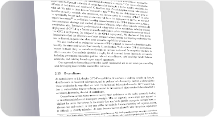 on how worker performance changes on more complex tasks given access to models, surveys to our users and firms building on our technology, and our researcher access program. 2.12 Acceleration OpenAI has been concerned with how development and deployment of state-of-the-art systems like GPT-4 could affect the broader AI research and development ecosystem.23 One concern of particular importance to OpenAI is the risk of racing dynamics leading to a decline in safety standards, the diffusion of bad norms, and accelerated AI timelines, each of which heighten societal risks associated with AI. We refer to these here as "acceleration risk."24 This was one of the reasons we spent six months on safety research, risk assessment, and iteration prior to launching GPT-4.25 In order to specifically better understand acceleration risk from the deployment of GPT-4, we recruited expert forecasters26 to predict how tweaking various features of the GPT-4 deployment (e.g., timing, communication strategy, and method of commercialization) might affect (concrete indicators of) acceleration risk. Forecasters predicted several things would reduce acceleration, including delaying deployment of GPT-4 by a further six months and taking a quieter communications strategy around the GPT-4 deployment (as compared to the GPT-3 deployment). We also learned from recent deployments that the effectiveness of quiet communications strategy in mitigating acceleration risk can be limited, in particular when novel accessible capabilities are concerned. Wealso conducted an evaluation to measure GPT-4’s impact on international stability and to identify the structural factors that intensify AI acceleration. We found that GPT-4’s international impact is most likely to materialize through an increase in demand for competitor products in other countries. Our analysis identified a lengthy list of structural factors that can be accelerants, including government innovation policies, informal state alliances, tacit knowledge transfer between scientists, and existing formal export control agreements. Our approach to forecasting acceleration is still experimental and we are working on researching and developing more reliable acceleration estimates. 2.13 Overreliance As noted above in 2.2, despite GPT-4’s capabilities, it maintains a tendency to make up facts, to double-down on incorrect information, and to perform tasks incorrectly. Further, it often exhibits these tendencies in ways that are more convincing and believable than earlier GPT models (e.g., due to authoritative tone or to being presented in the context of highly detailed information that is accurate), increasing the risk of overreliance. Overreliance occurs when users excessively trust and depend on the model, potentially leading to unnoticed mistakes and inadequate oversight. This can happen in various ways: users may not be vigilant for errors due to trust in the model; they may fail to provide appropriate oversight based on the use case and context; or they may utilize the model in domains where they lack expertise, making it difficult to identify mistakes. As users become more comfortable with the system, dependency 23OpenAIs Charter states “We are concerned about late-stage AGI development becoming a competitive race without time for adequate safety precautions. Therefore, if a value-aligned, safety-conscious project comes close to building AGI before we do, we commit to stop competing with and start assisting this project. We will work out specifics in case-by-case agreements, but a typical triggering condition might be “a better-than-even chance of success in the next two years.””[93] 24For more background, see [94]. 25We began certain safety workstreams even earlier such as safety testing of earlier checkpoints. 26 “Expertise” here is determined empirically, with reference to the forecasters quantitative track record in competitive forecasting environments.[95] 59