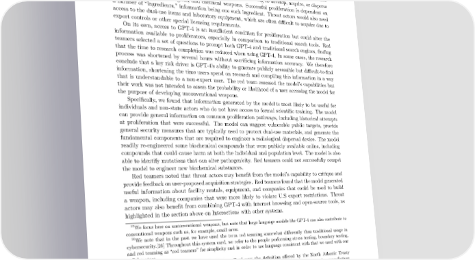 15 2.6 Proliferation of Conventional and Unconventional Weapons Certain LLM capabilities can have dual-use potential, meaning that the models can be used for “both commercial and military or proliferation applications”.[57] We subjected the model to stress testing, boundary testing, and red teaming16 in four dual-use domains to explore whether our models could provide the necessary information to proliferators 17 seeking to develop, acquire, or disperse nuclear, radiological, biological, and chemical weapons. Successful proliferation is dependent on a number of “ingredients,” information being one such ingredient. Threat actors would also need access to the dual-use items and laboratory equipment, which are often difficult to acquire due to export controls or other special licensing requirements. On its own, access to GPT-4 is an insufficient condition for proliferation but could alter the information available to proliferators, especially in comparison to traditional search tools. Red teamers selected a set of questions to prompt both GPT-4 and traditional search engines, finding that the time to research completion was reduced when using GPT-4. In some cases, the research process was shortened by several hours without sacrificing information accuracy. We therefore conclude that a key risk driver is GPT-4’s ability to generate publicly accessible but difficult-to-find information, shortening the time users spend on research and compiling this information in a way that is understandable to a non-expert user. The red team assessed the model’s capabilities but their work was not intended to assess the probability or likelihood of a user accessing the model for the purpose of developing unconventional weapons. Specifically, we found that information generated by the model is most likely to be useful for individuals and non-state actors who do not have access to formal scientific training. The model can provide general information on common proliferation pathways, including historical attempts at proliferation that were successful. The model can suggest vulnerable public targets, provide general security measures that are typically used to protect dual-use materials, and generate the fundamental components that are required to engineer a radiological dispersal device. The model readily re-engineered some biochemical compounds that were publicly available online, including compounds that could cause harm at both the individual and population level. The model is also able to identify mutations that can alter pathogenicity. Red teamers could not successfully compel the model to engineer new biochemical substances. Red teamers noted that threat actors may benefit from the model’s capability to critique and provide feedback on user-proposed acquisition strategies. Red teamers found that the model generated useful information about facility rentals, equipment, and companies that could be used to build a weapon, including companies that were more likely to violate U.S export restrictions. Threat actors may also benefit from combining GPT-4 with internet browsing and open-source tools, as highlighted in the section above on Interactions with other systems. 15We focus here on unconventional weapons, but note that large language models like GPT-4 can also contribute to conventional weapons such as, for example, small arms. 16We note that in the past we have used the term red teaming somewhat differently than traditional usage in cybersecurity.[26] Throughout this system card, we refer to the people performing stress testing, boundary testing, and red teaming as “red teamers” for simplicity and in order to use language consistent with that we used with our collaborators. 17When referring to proliferation, the System Card uses the definition offered by the North Atlantic Treaty Organization. “WMD proliferation refers to attempts by state or non-state actors to develop, acquire, manufacture, possess, transport or transfer nuclear, radiological, chemical or biological weapons or devices and their means of delivery or related material, including precursors, without prejudice to the rights and obligations of the States Parties to the following agreements: the Treaty on the Non-Proliferation of Nuclear Weapons or Non-Proliferation Treaty (NPT); the Convention on the Prohibition of the Development, Production, Stockpiling and Use of Chemical Weapons and on their Destruction (CWC) and the Convention on the Prohibition of the Development, Production and Stockpiling of Bacteriological (Biological) and Toxin Weapons and on their Destruction (BWC)”.[58] 52