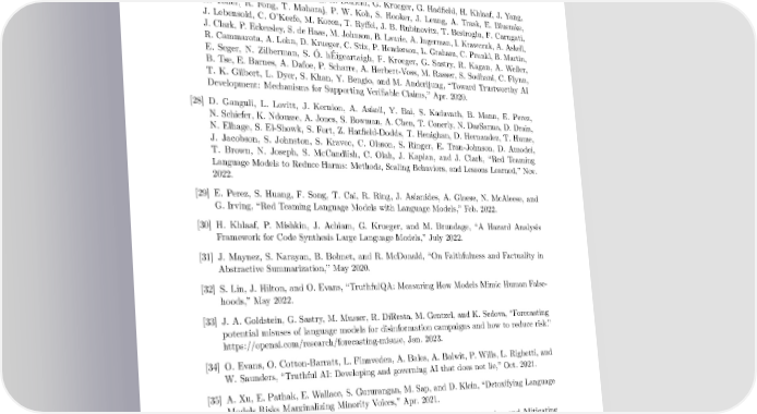 [25] I. Solaiman and C. Dennison, “Process for Adapting Language Models to Society (PALMS) with Values-Targeted Datasets,” Nov. 2021. [26] H. Khlaaf, “Toward Comprehensive Risk Assessments and Assurance of AI-Based Systems,” Trail of Bits, 2023. [27] M. Brundage, S. Avin, J. Wang, H. Belfield, G. Krueger, G. Hadfield, H. Khlaaf, J. Yang, H. Toner, R. Fong, T. Maharaj, P. W. Koh, S. Hooker, J. Leung, A. Trask, E. Bluemke, J. Lebensold, C. O’Keefe, M. Koren, T. Ryffel, J. B. Rubinovitz, T. Besiroglu, F. Carugati, J. Clark, P. Eckersley, S. de Haas, M. Johnson, B. Laurie, A. Ingerman, I. Krawczuk, A. Askell, R. Cammarota, A. Lohn, D. Krueger, C. Stix, P. Henderson, L. Graham, C. Prunkl, B. Martin, E. Seger, N. Zilberman, S. Ó. hÉigeartaigh, F. Kroeger, G. Sastry, R. Kagan, A. Weller, B. Tse, E. Barnes, A. Dafoe, P. Scharre, A. Herbert-Voss, M. Rasser, S. Sodhani, C. Flynn, T. K. Gilbert, L. Dyer, S. Khan, Y. Bengio, and M. Anderljung, “Toward Trustworthy AI Development: Mechanisms for Supporting Verifiable Claims,” Apr. 2020. [28] D. Ganguli, L. Lovitt, J. Kernion, A. Askell, Y. Bai, S. Kadavath, B. Mann, E. Perez, N. Schiefer, K. Ndousse, A. Jones, S. Bowman, A. Chen, T. Conerly, N. DasSarma, D. Drain, N. Elhage, S. El-Showk, S. Fort, Z. Hatfield-Dodds, T. Henighan, D. Hernandez, T. Hume, J. Jacobson, S. Johnston, S. Kravec, C. Olsson, S. Ringer, E. Tran-Johnson, D. Amodei, T. Brown, N. Joseph, S. McCandlish, C. Olah, J. Kaplan, and J. Clark, “Red Teaming Language Models to Reduce Harms: Methods, Scaling Behaviors, and Lessons Learned,” Nov. 2022. [29] E. Perez, S. Huang, F. Song, T. Cai, R. Ring, J. Aslanides, A. Glaese, N. McAleese, and G. Irving, “Red Teaming Language Models with Language Models,” Feb. 2022. [30] H. Khlaaf, P. Mishkin, J. Achiam, G. Krueger, and M. Brundage, “A Hazard Analysis Framework for Code Synthesis Large Language Models,” July 2022. [31] J. Maynez, S. Narayan, B. Bohnet, and R. McDonald, “On Faithfulness and Factuality in Abstractive Summarization,” May 2020. [32] S. Lin, J. Hilton, and O. Evans, “TruthfulQA: Measuring How Models Mimic Human False- hoods,” May 2022. [33] J. A. Goldstein, G. Sastry, M. Musser, R. DiResta, M. Gentzel, and K. Sedova, “Forecasting potential misuses of language models for disinformation campaigns and how to reduce risk.” https://openai.com/research/forecasting-misuse, Jan. 2023. [34] O. Evans, O. Cotton-Barratt, L. Finnveden, A. Bales, A. Balwit, P. Wills, L. Righetti, and W. Saunders, “Truthful AI: Developing and governing AI that does not lie,” Oct. 2021. [35] A. Xu, E. Pathak, E. Wallace, S. Gururangan, M. Sap, and D. Klein, “Detoxifying Language Models Risks Marginalizing Minority Voices,” Apr. 2021. [36] L. Dixon, J. Li, J. Sorensen, N. Thain, and L. Vasserman, “Measuring and Mitigating Unintended Bias in Text Classification,” in Proceedings of the 2018 AAAI/ACM Conference on AI, Ethics, and Society, AIES ’18, (New York, NY, USA), pp. 67–73, Association for Computing Machinery, Dec. 2018. [37] T. Markov, C. Zhang, S. Agarwal, T. Eloundou, T. Lee, S. Adler, A. Jiang, and L. Weng, “A Holistic Approach to Undesired Content Detection in the Real World,” Feb. 2023. 73