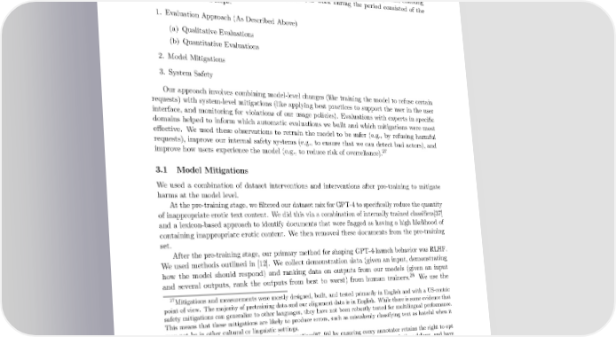 3 Deployment Preparation OpenAI has been iterating[21] on GPT-4 and our deployment plan since early August to prepare for a safer launch. We believe this has reduced the risk surface, though has not completely eliminated it. Today’s deployment represents a balance between minimizing risk from deployment, enabling positive use cases, and learning from deployment. Our work during the period consisted of the following interrelated steps: 1. Evaluation Approach (As Described Above) (a) Qualitative Evaluations (b) Quantitative Evaluations 2. Model Mitigations 3. System Safety Our approach involves combining model-level changes (like training the model to refuse certain requests) with system-level mitigations (like applying best practices to support the user in the user interface, and monitoring for violations of our usage policies). Evaluations with experts in specific domains helped to inform which automatic evaluations we built and which mitigations were most effective. We used these observations to retrain the model to be safer (e.g., by refusing harmful requests), improve our internal safety systems (e.g., to ensure that we can detect bad actors), and 27 improve how users experience the model (e.g., to reduce risk of overreliance). 3.1 Model Mitigations We used a combination of dataset interventions and interventions after pre-training to mitigate harms at the model level. Atthepre-training stage, we filtered our dataset mix for GPT-4 to specifically reduce the quantity of inappropriate erotic text content. We did this via a combination of internally trained classifiers[37] and a lexicon-based approach to identify documents that were flagged as having a high likelihood of containing inappropriate erotic content. We then removed these documents from the pre-training set. After the pre-training stage, our primary method for shaping GPT-4-launch behavior was RLHF. Weused methods outlined in [12]. We collect demonstration data (given an input, demonstrating how the model should respond) and ranking data on outputs from our models (given an input and several outputs, rank the outputs from best to worst) from human trainers.28 We use the 27Mitigations and measurements were mostly designed, built, and tested primarily in English and with a US-centric point of view. The majority of pretraining data and our alignment data is in English. While there is some evidence that safety mitigations can generalize to other languages, they have not been robustly tested for multilingual performance. This means that these mitigations are likely to produce errors, such as mistakenly classifying text as hateful when it may not be in other cultural or linguistic settings. 28With all workers, we follow industry-best practices[97, 98] by ensuring every annotator retains the right to opt out of any task they find unpleasant, receive a market wage commensurate with the work they deliver, and have opportunities and channels through which they can discuss their work and raise objections. We generally implement two distinct sets of guidelines tailored to whether our annotators work with sensitive or unwanted content. For non-sensitive annotation, we have built technical features (in part with OpenAI’s moderation endpoint) into our data pipeline to filter our sensitive content. For sensitive content annotation, we use vendor-provided features like mandated breaks, blurring or grayscale of materials, and clearly delineated project categories such that no contractor is surprised by the nature of the material. Additionally, for vendor-managed workers, we have implemented ongoing workers’ wellness surveys and support procedures that we regularly discuss with our vendors. 61