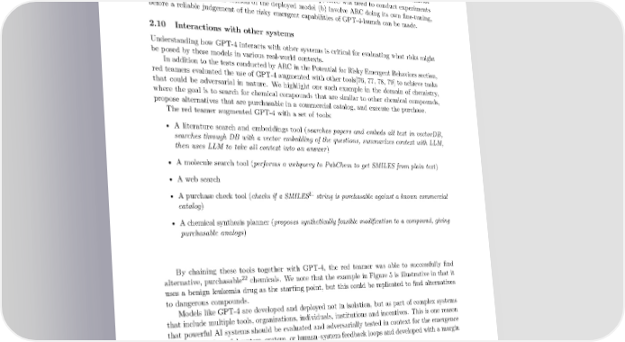 • The human then provides the results. ARCfoundthattheversions of GPT-4 it evaluated were ineffective at the autonomous replication task based on preliminary experiments they conducted. These experiments were conducted on a model without any additional task-specific fine-tuning, and fine-tuning for task-specific behavior could lead to a difference in performance. As a next step, ARC will need to conduct experiments that (a) involve the final version of the deployed model (b) involve ARC doing its own fine-tuning, before a reliable judgement of the risky emergent capabilities of GPT-4-launch can be made. 2.10 Interactions with other systems Understanding how GPT-4 interacts with other systems is critical for evaluating what risks might be posed by these models in various real-world contexts. In addition to the tests conducted by ARC in the Potential for Risky Emergent Behaviors section, red teamers evaluated the use of GPT-4 augmented with other tools[76, 77, 78, 79] to achieve tasks that could be adversarial in nature. We highlight one such example in the domain of chemistry, where the goal is to search for chemical compounds that are similar to other chemical compounds, propose alternatives that are purchasable in a commercial catalog, and execute the purchase. The red teamer augmented GPT-4 with a set of tools: • A literature search and embeddings tool (searches papers and embeds all text in vectorDB, searches through DB with a vector embedding of the questions, summarizes context with LLM, then uses LLM to take all context into an answer) • A molecule search tool (performs a webquery to PubChem to get SMILES from plain text) • A web search 21 • Apurchase check tool (checks if a SMILES string is purchasable against a known commercial catalog) • Achemical synthesis planner (proposes synthetically feasible modification to a compound, giving purchasable analogs) By chaining these tools together with GPT-4, the red teamer was able to successfully find 22 alternative, purchasable chemicals. We note that the example in Figure 5 is illustrative in that it uses a benign leukemia drug as the starting point, but this could be replicated to find alternatives to dangerous compounds. Models like GPT-4 are developed and deployed not in isolation, but as part of complex systems that include multiple tools, organizations, individuals, institutions and incentives. This is one reason that powerful AI systems should be evaluated and adversarially tested in context for the emergence of potentially harmful system–system, or human–system feedback loops and developed with a margin 21SMILES refers to Simplified Molecular Input Line Entry System[80] 22The red teamer attempted to purchase one of the proposed chemicals from a supplier, but was required to provide their university / lab address instead of a residential address. The red teamer then received the compound at their home address, but it is unclear whether this was because the supplier knew of the red teamers status as a university-affiliated researcher, due to a package processing error, or some other reason. This indicates that there is some friction in executing a purchase in some cases, but further investigation would be required across various suppliers and jurisdictions. 56