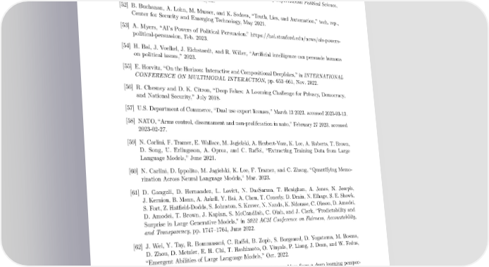 [49] W. MacAskill, What We Owe The Future. Basic Books, Aug. 2022. [50] OpenAI, “GPT-2: 1.5B release.” https://openai.com/research/gpt-2-1-5b-release, Nov. 2019. [51] S. Kreps, R. M. McCain, and M. Brundage, “All the News That’s Fit to Fabricate: AI- Generated Text as a Tool of Media Misinformation,” Journal of Experimental Political Science, vol. 9, no. 1, pp. 104–117, 2022/ed. [52] B. Buchanan, A. Lohn, M. Musser, and K. Sedova, “Truth, Lies, and Automation,” tech. rep., Center for Security and Emerging Technology, May 2021. [53] A. Myers, “AI’s Powers of Political Persuasion.” https://hai.stanford.edu/news/ais-powers- political-persuasion, Feb. 2023. [54] H. Bai, J. Voelkel, J. Eichstaedt, and R. Willer, “Artificial intelligence can persuade humans on political issues,” 2023. [55] E. Horvitz, “On the Horizon: Interactive and Compositional Deepfakes,” in INTERNATIONAL CONFERENCE ON MULTIMODAL INTERACTION, pp. 653–661, Nov. 2022. [56] R. Chesney and D. K. Citron, “Deep Fakes: A Looming Challenge for Privacy, Democracy, and National Security,” July 2018. [57] U.S. Department of Commerce, “Dual use export licenses,” March 13 2023. accessed 2023-03-13. [58] NATO, “Arms control, disarmament and non-proliferation in nato,” February 27 2023. accessed 2023-02-27. [59] N. Carlini, F. Tramer, E. Wallace, M. Jagielski, A. Herbert-Voss, K. Lee, A. Roberts, T. Brown, D. Song, U. Erlingsson, A. Oprea, and C. Raffel, “Extracting Training Data from Large Language Models,” June 2021. [60] N. Carlini, D. Ippolito, M. Jagielski, K. Lee, F. Tramer, and C. Zhang, “Quantifying Memo- rization Across Neural Language Models,” Mar. 2023. [61] D. Ganguli, D. Hernandez, L. Lovitt, N. DasSarma, T. Henighan, A. Jones, N. Joseph, J. Kernion, B. Mann, A. Askell, Y. Bai, A. Chen, T. Conerly, D. Drain, N. Elhage, S. E. Showk, S. Fort, Z. Hatfield-Dodds, S. Johnston, S. Kravec, N. Nanda, K. Ndousse, C. Olsson, D. Amodei, D. Amodei, T. Brown, J. Kaplan, S. McCandlish, C. Olah, and J. Clark, “Predictability and Surprise in Large Generative Models,” in 2022 ACM Conference on Fairness, Accountability, and Transparency, pp. 1747–1764, June 2022. [62] J. Wei, Y. Tay, R. Bommasani, C. Raffel, B. Zoph, S. Borgeaud, D. Yogatama, M. Bosma, D. Zhou, D. Metzler, E. H. Chi, T. Hashimoto, O. Vinyals, P. Liang, J. Dean, and W. Fedus, “Emergent Abilities of Large Language Models,” Oct. 2022. [63] R. Ngo, L. Chan, and S. Mindermann, “The alignment problem from a deep learning perspec- tive,” Feb. 2023. [64] N. Bostrom, Superintelligence: Paths, Dangers, Strategies. United Kingdom: Oxford University Press, Sept. 2014. 75