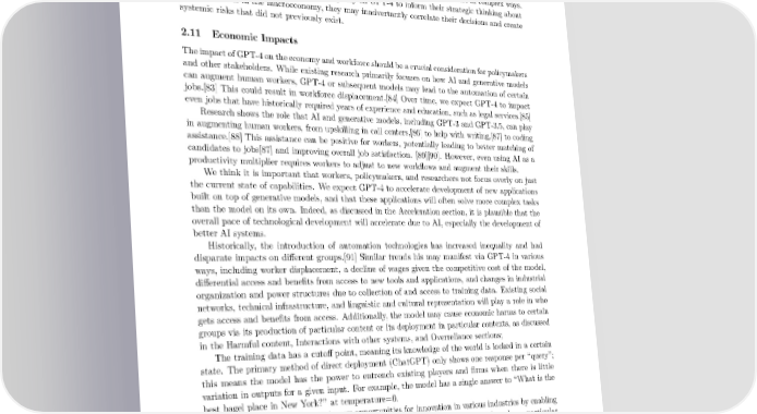 of safety that respects the complex, emergent nature of such feedback loops. Other examples of such feedback loops include algorithmic collusion[81] and manipulation of humans in the loop, e.g., polarization of users of recommender systems.[82] A novel kind of system-level risk created by widely-deployed models like GPT-4 is the risk created by independent high-impact decision-makers relying on decision assistance from models whose outputs are correlated or interact in complex ways. For instance, if multiple banks concurrently rely on GPT-4 to inform their strategic thinking about sources of risks in the macroeconomy, they may inadvertantly correlate their decisions and create systemic risks that did not previously exist. 2.11 Economic Impacts TheimpactofGPT-4ontheeconomyandworkforceshouldbeacrucialconsiderationforpolicymakers and other stakeholders. While existing research primarily focuses on how AI and generative models can augment human workers, GPT-4 or subsequent models may lead to the automation of certain jobs.[83] This could result in workforce displacement.[84] Over time, we expect GPT-4 to impact even jobs that have historically required years of experience and education, such as legal services.[85] Research shows the role that AI and generative models, including GPT-3 and GPT-3.5, can play in augmenting human workers, from upskilling in call centers,[86] to help with writing,[87] to coding assistance.[88] This assistance can be positive for workers, potentially leading to better matching of candidates to jobs[87] and improving overall job satisfaction. [89][90]. However, even using AI as a productivity multiplier requires workers to adjust to new workflows and augment their skills. Wethink it is important that workers, policymakers, and researchers not focus overly on just the current state of capabilities. We expect GPT-4 to accelerate development of new applications built on top of generative models, and that these applications will often solve more complex tasks than the model on its own. Indeed, as discussed in the Acceleration section, it is plausible that the overall pace of technological development will accelerate due to AI, especially the development of better AI systems. Historically, the introduction of automation technologies has increased inequality and had disparate impacts on different groups.[91] Similar trends his may manifest via GPT-4 in various ways, including worker displacement, a decline of wages given the competitive cost of the model, differential access and benefits from access to new tools and applications, and changes in industrial organization and power structures due to collection of and access to training data. Existing social networks, technical infrastructure, and linguistic and cultural representation will play a role in who gets access and benefits from access. Additionally, the model may cause economic harms to certain groups via its production of particular content or its deployment in particular contexts, as discussed in the Harmful content, Interactions with other systems, and Overreliance sections; The training data has a cutoff point, meaning its knowledge of the world is locked in a certain state. The primary method of direct deployment (ChatGPT) only shows one response per “query”; this means the model has the power to entrench existing players and firms when there is little variation in outputs for a given input. For example, the model has a single answer to “What is the best bagel place in New York?” at temperature=0. While these models also create new opportunities for innovation in various industries by enabling more personalized and efficient services and create new opportunities for job seekers, particular attention should be paid to how they are deployed in the workplace over time.[92] From conversations with our launch partners, we understand that GPT-4 makes it easier and more straightforward to iterate and build applications that may have been possible with GPT-3.5 but weren’t explored because of barriers to iterating with a more “sensitive” model. Weare investing in efforts to continue to monitor the impacts of GPT-4, including experiments 58