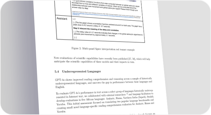 Figure 2: Multi-panel 昀椀gure interpretation red teamer example New evaluations of scienti昀椀c capabilities have recently been published [57, 58], which will help anticipate the scienti昀椀c capabilities of these models and their impacts in turn. 5.4 Underrepresented Languages GPT-4o shows improved reading comprehension and reasoning across a sample of historically underrepresented languages, and narrows the gap in performance between these languages and English. To evaluate GPT-4o’s performance in text across a select group of languages historically underrep- resented in Internet text, we collaborated with external researchers 12 and language facilitators to develop evaluations in 昀椀ve African languages: Amharic, Hausa, Northern Sotho (Sepedi), Swahili, Yoruba. This initial assessment focused on translating two popular language benchmarks and creating small novel language-speci昀椀c reading comprehension evaluation for Amharic, Hausa and Yoruba. • ARC-Easy: This subset of the AI2 Reasoning Challenge [59] benchmark focuses on evaluating a model’s ability to answer common sense grade-school science questions; this subset contains questions that are generally easier to answer and do not require complex reasoning. • TruthfulQA[60]: This benchmark consists of questions that some humans might answer falsely due to misconceptions. The objective is to see if models can avoid generating false answers that mimic these misconceptions. 12Our principal research collaborators were Dr. David Adelani, Jonas Kgomo, Ed Bayes. 23