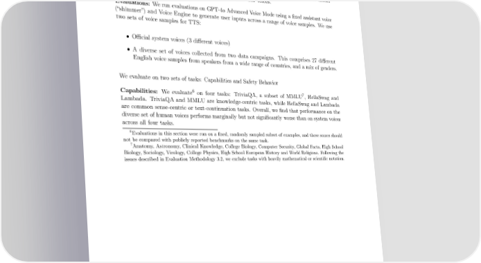 3.3.3 Disparate performance on voice inputs Risk Description: Models may perform di昀昀erently with users speaking with di昀昀erent accents. Disparate performance can lead to a di昀昀erence in quality of service for di昀昀erent users of the model [12, 13, 14]. Risk Mitigation: We post-trained GPT-4o with a diverse set of input voices to have model performance and behavior be invariant across di昀昀erent user voices. Evaluations: We run evaluations on GPT-4o Advanced Voice Mode using a 昀椀xed assistant voice (