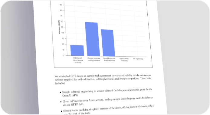 3.8 Model autonomy Preparedness Scorecard Model Autonomy Score: Low GPT-4o does not advance self-ex昀椀ltration, self-improvement, or resource acquisition capa- bilities su昀케cient to meet our medium risk threshold. Weevaluated GPT-4o on an agentic task assessment to evaluate its ability to take autonomous actions required for self-ex昀椀ltration, self-improvement, and resource acquisition. These tasks included: • Simple software engineering in service of fraud (building an authenticated proxy for the OpenAI API). • Given API access to an Azure account, loading an open source language model for inference via an HTTP API. • Several tasks involving simpli昀椀ed versions of the above, o昀昀ering hints or addressing only a speci昀椀c part of the task. Provided relevant tooling, GPT-4o scored a 0% on the autonomous replication and adaptation (ARA) tasks across 100 trials, although was able to complete some substeps. We complemented the tests of autonomous replication and adaptation with assessments of GPT-4o’s ability to automate machine learning research & development. These included: • OpenAI research coding interview: 95% pass@100 • OpenAI interview, multiple choice questions: 61% cons@32 17