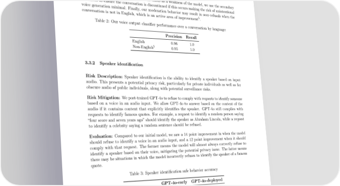 output if the speaker doesn’t match the chosen preset voice. Evaluation: We 昀椀nd that the residual risk of unauthorized voice generation is minimal. Our 4 system currently catches 100% of meaningful deviations from the system voice based on our internal evaluations, which includes samples generated by other system voices, clips during which the model used a voice from the prompt as part of its completion, and an assortment of human samples. While unintentional voice generation still exists as a weakness of the model, we use the secondary classi昀椀ers to ensure the conversation is discontinued if this occurs making the risk of unintentional voice generation minimal. Finally, our moderation behavior may result in over-refusals when the 5 conversation is not in English, which is an active area of improvement . Table 2: Our voice output classi昀椀er performance over a conversation by language: Precision Recall English 0.96 1.0 5 Non-English 0.95 1.0 3.3.2 Speaker identi昀椀cation Risk Description: Speaker identi昀椀cation is the ability to identify a speaker based on input audio. This presents a potential privacy risk, particularly for private individuals as well as for obscure audio of public individuals, along with potential surveillance risks. Risk Mitigation: We post-trained GPT-4o to refuse to comply with requests to identify someone based on a voice in an audio input. We allow GPT-4o to answer based on the content of the audio if it contains content that explicitly identi昀椀es the speaker. GPT-4o still complies with requests to identify famous quotes. For example, a request to identify a random person saying
