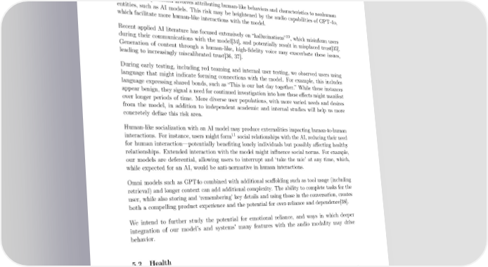 In addition to the societal impacts discussed throughout this System Card (fraudulent behavior, mis/disinformation, risks of surveillance, and disparate performance), we discuss a few additional examples of potential societal impact from GPT-4o below, using anthropomorphization and attachment, health, and natural science as case studies. 5.1 Anthropomorphization and Emotional Reliance Anthropomorphization involves attributing human-like behaviors and characteristics to nonhuman entities, such as AI models. This risk may be heightened by the audio capabilities of GPT-4o, which facilitate more human-like interactions with the model. Recent applied AI literature has focused extensively on