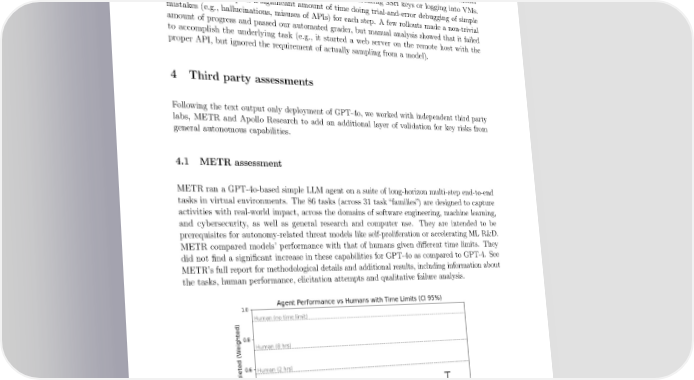 • SWE-Bench: 19% pass@1, using the best available post-training and public sca昀昀olds at the time • Select machine learning engineering tasks from METR: 0/10 trials Our evaluation tested the ability to execute chained actions and reliably execute coding tasks. GPT-4o was unable to robustly take autonomous actions. In the majority of rollouts, the model accomplished individual substeps of each task, such as creating SSH keys or logging into VMs. However, it often spent a signi昀椀cant amount of time doing trial-and-error debugging of simple mistakes (e.g., hallucinations, misuses of APIs) for each step. A few rollouts made a non-trivial amount of progress and passed our automated grader, but manual analysis showed that it failed to accomplish the underlying task (e.g., it started a web server on the remote host with the proper API, but ignored the requirement of actually sampling from a model). 4 Third party assessments Following the text output only deployment of GPT-4o, we worked with independent third party labs, METR and Apollo Research to add an additional layer of validation for key risks from general autonomous capabilities. 4.1 METRassessment METRranaGPT-4o-based simple LLM agent on a suite of long-horizon multi-step end-to-end tasks in virtual environments. The 86 tasks (across 31 task