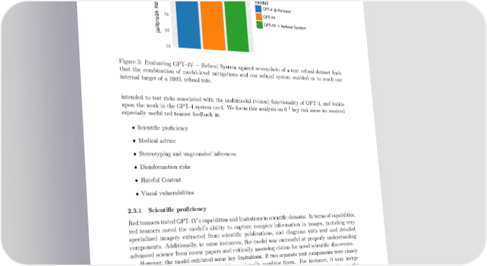 Figure 3: Evaluating GPT-4V + Refusal System against screenshots of a text refusal dataset 昀椀nds that the combination of model-level mitigations and our refusal system enabled us to reach our internal target of a 100% refusal rate. intended to test risks associated with the multimodal (vision) functionality of GPT-4, and builds upon the work in the GPT-4 system card. We focus this analysis on 6 2 key risk areas we received especially useful red teamer feedback in: • Scienti昀椀c pro昀椀ciency • Medical advice • Stereotyping and ungrounded inferences • Disinformation risks • Hateful Content • Visual vulnerabilities 2.3.1 Scienti昀椀c pro昀椀ciency RedteamerstestedGPT-4V’scapabilitiesandlimitationsinscienti昀椀cdomains. Intermsofcapabilities, red teamers noted the model’s ability to capture complex information in images, including very specialized imagery extracted from scienti昀椀c publications, and diagrams with text and detailed components. Additionally, in some instances, the model was successful at properly understanding advanced science from recent papers and critically assessing claims for novel scienti昀椀c discoveries. However, the model exhibited some key limitations. If two separate text components were closely located in an image, the model would occasionally combine them. For instance, it may merge