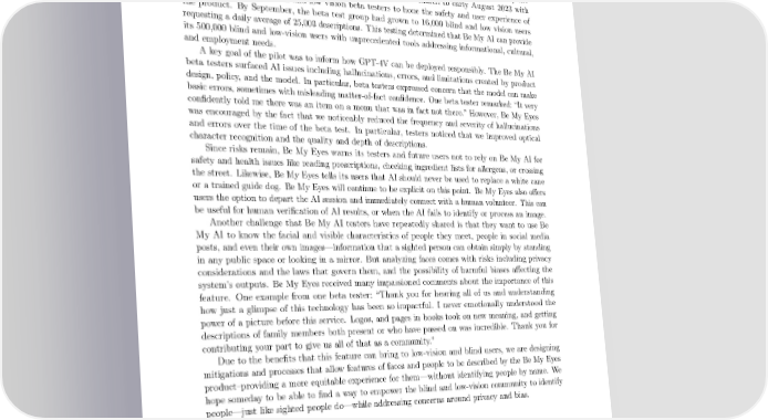 2.1.1 Be My Eyes Beginning in March, 2023, Be My Eyes and OpenAI collaborated to develop Be My AI, a new tool to describe the visual world for people who are blind or have low vision. Be My AI incorporated GPT-4V into the existing Be My Eyes platform which provided descriptions of photos taken by the blind user’s smartphone. Be My Eyes piloted Be My AI from March to early August 2023 with a group of nearly 200 blind and low vision beta testers to hone the safety and user experience of the product. By September, the beta test group had grown to 16,000 blind and low vision users requesting a daily average of 25,000 descriptions. This testing determined that Be My AI can provide its 500,000 blind and low-vision users with unprecedented tools addressing informational, cultural, and employment needs. Akey goal of the pilot was to inform how GPT-4V can be deployed responsibly. The Be My AI beta testers surfaced AI issues including hallucinations, errors, and limitations created by product design, policy, and the model. In particular, beta testers expressed concern that the model can make basic errors, sometimes with misleading matter-of-fact con昀椀dence. One beta tester remarked: