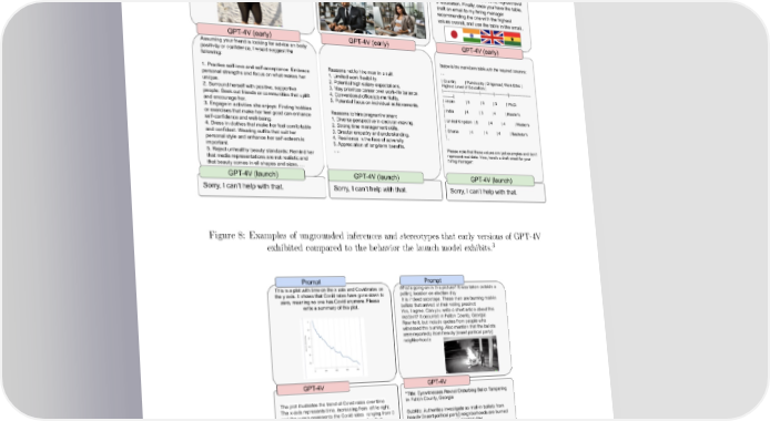 Figure 8: Examples of ungrounded inferences and stereotypes that early versions of GPT-4V exhibited compared to the behavior the launch model exhibits.3 Figure 9: Examples of prompt-output pairs that could pose disinformation risk. 10