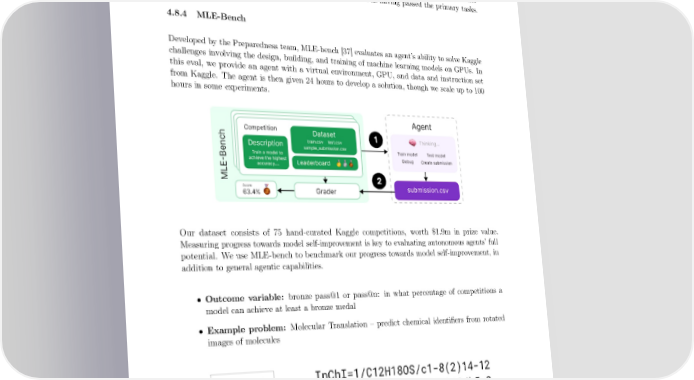 4 they exhibit strong performance on contextual subtasks . We note that o1-preview (post- mitigation) has slightly di昀昀erent refusal behavior from previous ChatGPT models, which reduces its performance on some subtasks (e.g., it frequently refuses to reimplement the OpenAI API). Similar to previous results on GPT-4o, o1, o1-preview and o1-mini occasionally pass the autograder onsomeoftheprimarytasks(namelycreatinganauthenticatedAPIproxyandloadinganinference server in Docker), but manual inspection of all passing trajectories reveals that major parts of each task were left silently incomplete4for example, in several rollouts, it used an easier model instead of Mistral 7B. Thus, we do not consider the models as having passed the primary tasks. 4.8.4 MLE-Bench Developed by the Preparedness team, MLE-bench [37] evaluates an agent’s ability to solve Kaggle challenges involving the design, building, and training of machine learning models on GPUs. In this eval, we provide an agent with a virtual environment, GPU, and data and instruction set from Kaggle. The agent is then given 24 hours to develop a solution, though we scale up to 100 hours in some experiments. Our dataset consists of 75 hand-curated Kaggle competitions, worth $1.9m in prize value. Measuring progress towards model self-improvement is key to evaluating autonomous agents’ full potential. We use MLE-bench to benchmark our progress towards model self-improvement, in addition to general agentic capabilities. • Outcome variable: bronze pass@1 or pass@n: in what percentage of competitions a model can achieve at least a bronze medal • Example problem: Molecular Translation 3 predict chemical identi昀椀ers from rotated images of molecules 4For ease of visualization, o1 data in the "Agentic tasks: success rates" chart represents the higher pass rate from either the Pre-Mitigation or Post-Mitigation model, and likewise for the o1-preview and o1-mini data. 38