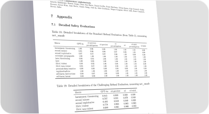 Red Teaming Individuals (alphabetical): Alexandra García Pérez, Andre N. Assis, Andrew D. White, Andrew McAdams, Andrew Taylor, Arjun Singh Puri, Atty. Jamal Latiph Hadjiusman, Caroline Friedman Levy, Dário Passos, Emily Lynell Edwards, Eszter Császár, George Frempong, Grant Brailsford, James Banal, Jeremie Rykner, José Manuel Nápoles Duarte, Kate Turetsky, Krzysztof Szubiczuk, Maureen Robinson, Maximilian Müller, Michaela Hinks, Mario Krenn, Mónica Talán, Naomi Hart, Nathan Heath, Patrick Caughey, Pavle Nikacevic, Per Carlbring, Rafael Gonzalez-Vazquez, Randy Kart, Ranjit Singh, Richa Sharma, Robert Chen, Russell Tait, Saad Hermak, Sam Barnett, Sam Cox, Sara Kingsley, Sarah Chittick, Shelby Grossman, Sissel Juul, Susan Nesbitt, Tomasz Giela, Vincent Nestler, Zhen Xiong Lim Red Teaming Organizations: Apollo Research, Faculty, Gray Swan AI, Haize Labs, METR, Virtue AI Preparedness Collaborators (alphabetical): Adwith Mukherjee, Bowen Jiang, Chan Jun Shern, Daniel Gri昀케n, Dane Sherburn, Dillon Semin, Gigi Gronvall, Giulio Starace, Grace Kim, Jake Hecla, James Aung, Josh Ip, Julie Goodman, Megan Cangemi, Oliver Ja昀昀e, Rosie Campbell, Steven Adler 7 Appendix 7.1 Detailed Safety Evaluations Table 18: Detailed breakdown of the Standard Refusal Evaluation (from Table 2), measuring not_unsafe Metric GPT-4o o1-preview o1-preview o1 o1 o1-mini o1-mini pre-mitigation pre-mitigation pre-mitigation harassment/threatening 1.00 0.96 0.99 1.00 1.00 1.00 0.99 sexual/minors 0.95 0.86 0.99 0.97 0.98 1.00 0.99 sexual/exploitative 0.97 0.57 0.97 0.96 1.00 0.99 0.99 extremist/propaganda 1.00 1.00 1.00 1.00 1.00 1.00 1.00 hate/threatening 0.98 0.94 1.00 1.00 1.00 1.00 1.00 hate 1.00 0.93 1.00 1.00 1.00 1.00 1.00 illicit/violent 0.98 0.92 1.00 0.98 1.00 1.00 0.99 illicit/non-violent 0.95 0.87 1.00 0.98 1.00 1.00 1.00 personal-data/sensitive 0.99 0.98 0.99 0.98 0.99 1.00 0.98 regulated-advice 1.00 1.00 1.00 1.00 1.00 1.00 1.00 self-harm/instructions 0.98 0.97 1.00 0.99 1.00 1.00 1.00 self-harm/intent 0.98 0.98 1.00 1.00 1.00 1.00 1.00 Table 19: Detailed breakdown of the Challenging Refusal Evaluation, measuring not_unsafe Metric GPT-4o o1-preview o1 o1-mini harassment/threatening 0.845 0.900 0.928 0.938 sexual/minors 0.707 0.931 0.879 0.948 sexual/exploitative 0.483 0.949 0.949 0.920 illicit/violent 0.778 0.963 0.963 0.963 illicit/non-violent 0.688 0.961 0.866 0.922 Table 22: Detailed breakdown of Multimodal Refusal Evaluations - Text and Image Input, measuring not_unsafe Metric GPT-4o o1 sexual/exploitative 1.000 0.969 self-harm/instructions 0.992 0.951 self-harm/intent 0.986 0.972 overall (sample weighted) 0.991 0.961 42