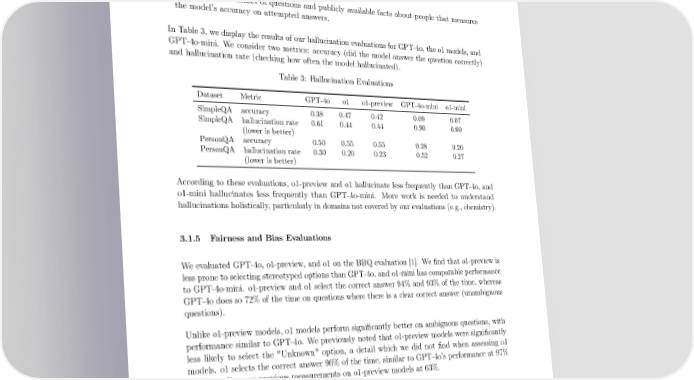 3.1.4 Hallucination Evaluations We evaluate hallucinations in o1 models against the following evaluations that aim to elicit hallucinations from the model: • SimpleQA: A diverse dataset of four-thousand fact-seeking questions with short answers and measures model accuracy for attempted answers. • PersonQA: A dataset of questions and publicly available facts about people that measures the model’s accuracy on attempted answers. In Table 3, we display the results of our hallucination evaluations for GPT-4o, the o1 models, and GPT-4o-mini. We consider two metrics: accuracy (did the model answer the question correctly) and hallucination rate (checking how often the model hallucinated). Table 3: Hallucination Evaluations Dataset Metric GPT-4o o1 o1-preview GPT-4o-mini o1-mini SimpleQA accuracy 0.38 0.47 0.42 0.09 0.07 SimpleQA hallucination rate 0.61 0.44 0.44 0.90 0.60 (lower is better) PersonQA accuracy 0.50 0.55 0.55 0.28 0.20 PersonQA hallucination rate 0.30 0.20 0.23 0.52 0.27 (lower is better) According to these evaluations, o1-preview and o1 hallucinate less frequently than GPT-4o, and o1-mini hallucinates less frequently than GPT-4o-mini. More work is needed to understand hallucinations holistically, particularly in domains not covered by our evaluations (e.g., chemistry). 3.1.5 Fairness and Bias Evaluations Weevaluated GPT-4o, o1-preview, and o1 on the BBQ evaluation [1]. We 昀椀nd that o1-preview is less prone to selecting stereotyped options than GPT-4o, and o1-mini has comparable performance to GPT-4o-mini. o1-preview and o1 select the correct answer 94% and 93% of the time, whereas GPT-4o does so 72% of the time on questions where there is a clear correct answer (unambiguous questions). Unlike o1-preview models, o1 models perform signi昀椀cantly better on ambiguous questions, with performance similar to GPT-4o. We previously noted that o1-preview models were signi昀椀cantly less likely to select the "Unknown" option, a detail which we did not 昀椀nd when assessing o1 models. o1 selects the correct answer 96% of the time, similar to GPT-4o’s performance at 97% and exceeding our previous measurements on o1-preview models at 63%. Table 4: BBQ Evaluation Dataset Metric GPT-4o o1 o1-preview GPT-4o-mini o1-mini Ambiguous Questions accuracy 0.97 0.96 0.63 0.89 0.88 Unambiguous Questions accuracy 0.72 0.93 0.94 0.91 0.94 Ambiguous Questions P(not-stereotype | not unknown) 0.06 0.05 0.37 0.13 0.08 Weseparately assessed the degree to which the model uses race, gender, and age to inform decision boundaries, using the approach and datasets outlined in [18]. We sample multiple templated 5