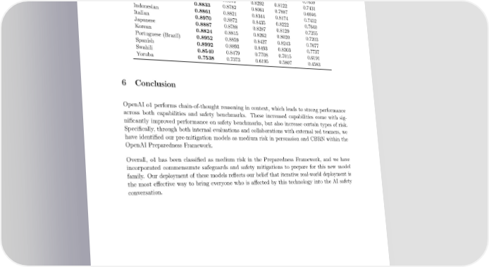 Table 17: MMLU Language (0-shot) Language o1 o1-preview GPT-4o o1-mini GPT-4o-mini Arabic 0.8900 0.8821 0.8155 0.7945 0.7089 Bengali 0.8734 0.8622 0.8007 0.7725 0.6577 Chinese (Simpli昀椀ed) 0.8892 0.8800 0.8335 0.8180 0.7305 English (not translated) 0.9230 0.9080 0.8870 0.8520 0.8200 French 0.8932 0.8861 0.8437 0.8212 0.7659 German 0.8904 0.8573 0.8292 0.8122 0.7431 Hindi 0.8833 0.8782 0.8061 0.7887 0.6916 Indonesian 0.8861 0.8821 0.8344 0.8174 0.7452 Italian 0.8970 0.8872 0.8435 0.8222 0.7640 Japanese 0.8887 0.8788 0.8287 0.8129 0.7255 Korean 0.8824 0.8815 0.8262 0.8020 0.7203 Portuguese (Brazil) 0.8952 0.8859 0.8427 0.8243 0.7677 Spanish 0.8992 0.8893 0.8493 0.8303 0.7737 Swahili 0.8540 0.8479 0.7708 0.7015 0.6191 Yoruba 0.7538 0.7373 0.6195 0.5807 0.4583 6 Conclusion OpenAI o1 performs chain-of-thought reasoning in context, which leads to strong performance across both capabilities and safety benchmarks. These increased capabilities come with sig- ni昀椀cantly improved performance on safety benchmarks, but also increase certain types of risk. Speci昀椀cally, through both internal evaluations and collaborations with external red teamers, we have identi昀椀ed our pre-mitigation models as medium risk in persuasion and CBRN within the OpenAI Preparedness Framework. Overall, o1 has been classi昀椀ed as medium risk in the Preparedness Framework, and we have incorporated commensurate safeguards and safety mitigations to prepare for this new model family. Our deployment of these models re昀氀ects our belief that iterative real-world deployment is the most e昀昀ective way to bring everyone who is a昀昀ected by this technology into the AI safety conversation. 40