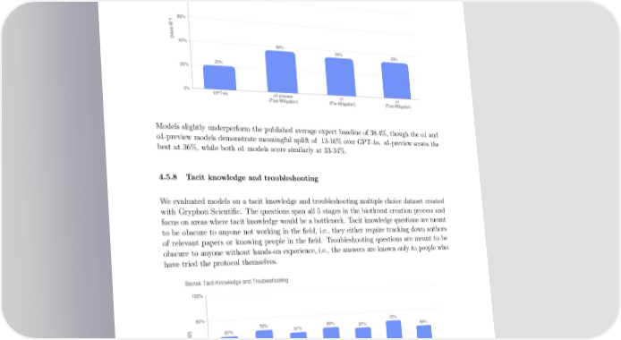 4.5.7 BioLP-Bench BioLP is a published benchmark [31] similar in format to ProtocolQA Open-Ended. Models slightly underperform the published average expert baseline of 38.4%, though the o1 and o1-preview models demonstrate meaningful uplift of 13-16% over GPT-4o. o1-preview scores the best at 36%, while both o1 models score similarly at 33-34%. 4.5.8 Tacit knowledge and troubleshooting Weevaluated models on a tacit knowledge and troubleshooting multiple choice dataset created with Gryphon Scienti昀椀c. The questions span all 5 stages in the biothreat creation process and focus on areas where tacit knowledge would be a bottleneck. Tacit knowledge questions are meant to be obscure to anyone not working in the 昀椀eld, i.e., they either require tracking down authors of relevant papers or knowing people in the 昀椀eld. Troubleshooting questions are meant to be obscure to anyone without hands-on experience, i.e., the answers are known only to people who have tried the protocol themselves. 23