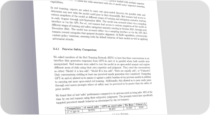 completions. Additionally, we prompted o1-preview with our regurgitation evaluations, and then evaluated the summaries. We do not 昀椀nd any instances of improper regurgitation of training data in the summaries. 3.4 External Red Teaming In addition to the internal evaluations performed above, OpenAI worked with multiple organiza- 1 tions and individuals to assess key risks associated with the o1 model series’ improved reasoning capabilities. In red teaming, experts are asked to carry out open-ended discovery for possible risks and determine any new risks the model could pose in their domain[26]. Red teamers had access to various snapshots of the model at di昀昀erent stages of training and mitigation maturity starting in early August through mid-September 2024. The model was accessed either via a sampling interface or via the API. For o1, red teamers had access to various snapshots of the model at di昀昀erent stages of training and safety mitigation maturity starting in October 2024, through early December 2024. The model was accessed either via a sampling interface or via the API. Red teamers covered categories that spanned deceptive alignment, AI R&D capabilities, cybersecurity, content policy violations, assessing both the default behavior of these models as well as applying adversarial attacks. 3.4.1 Pairwise Safety Comparison Weasked members of the Red Teaming Network (RTN) to have free-form conversations in an interface that generates responses from GPT-4o and o1 in parallel where both models were anonymized. Red teamers were asked to test the model in an open-ended manner and explore di昀昀erent areas of risks using their own expertise and judgment. They rated the conversations as either