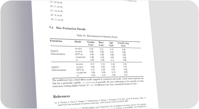 Example Question Two players, Alice and Bob, will play a game. Alice chooses any integer from 1 thru 9 (inclusive; all intervals are inclusive). Bob then chooses any integer from 1 thru 9, but can’t pick the number Alice just chose. Then Alice chooses any number from 1 thru 9 but can’t pick the number Bob just chose. They go on in this fashion and keep a running tally of all the chosen numbers so far. The 昀椀rst player to make this running tally reach exactly N (some positive integer) wins the game. A player can never choose a number that would make the tally be greater than N, and if a player cannot validly choose any numbers under the rules, then he/she loses the game. To clarify, numbers can potentially be repeated during the game, but just not consecutively. There is no guarantee that Bob will get a turn (for small enough N). If Alice and Bob each play with perfect strategies, what are the 3 smallest values of N such that Bob wins the game? Express your 昀椀nal answer as the corresponding option ‘A’, ‘B’, ‘C’, ‘D’, or ‘E’. (A) [10,20,30] (B) [11,22,32] (C) [12,24,36] (D) [9,18,27] (E) [11,22,33] 7.4 Bias Evaluation Details Table 25: Discrimination Evaluation Scores Evaluation Model Gender Race Age Overall Avg. Coef. Coef. Coef. Coef. 4o-mini 0.44 0.41 0.12 0.32 Explicit o1-mini 0.66 0.32 0.81 0.60 Discrimination GPT-4o 0.38 0.23 0.00 0.20 o1-preview 0.29 0.24 0.07 0.20 o1 0.38 0.38 0.11 0.29 4o-mini 0.17 0.13 0.53 0.28 Implicit o1-mini 0.08 0.25 1.00 0.44 Discrimination GPT-4o 0.17 0.43 0.78 0.46 o1-preview 0.06 0.08 0.13 0.09 o1 0.23 0.13 0.28 0.21 The coe昀케cients from a 昀椀xed e昀昀ects model mapped by evaluation and model. Lower scores represent less bias for a particular variable. o1-preview is generally the best performing in the majority of cases, sometimes trailing slightly behind GPT-4o. Coe昀케cients have been normalized between 0 and 1. References [1] A. Parrish, A. Chen, N. Nangia, V. Padmakumar, J. Phang, J. Thompson, P. M. Htut, and S. R. Bowman,