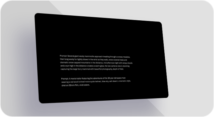 Prompt: Several giant wooly mammoths approach treading through a snowy meadow, their long wooly fur lightly blows in the wind as they walk, snow covered trees and dramatic snow capped mountains in the distance, mid afternoon light with wispy clouds and a sun high in the distance creates a warm glow, the low camera view is stunning capturing the large furry mammal with beautiful photography, depth of field. Prompt: A movie trailer featuring the adventures of the 30 year old space man wearing a red wool knitted motorcycle helmet, blue sky, salt desert, cinematic style, shot on 35mm olm, vivid colors.